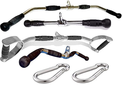 A Cable Machine Attachments Combo is a comprehensive set of accessories designed to enhance the versatility and functionality of cable machines in strength training. This combo typically includes a variety of handles and bars, each serving a specific purpose to target different muscle groups effectively. Below is a detailed description of the common components found in such a combo: