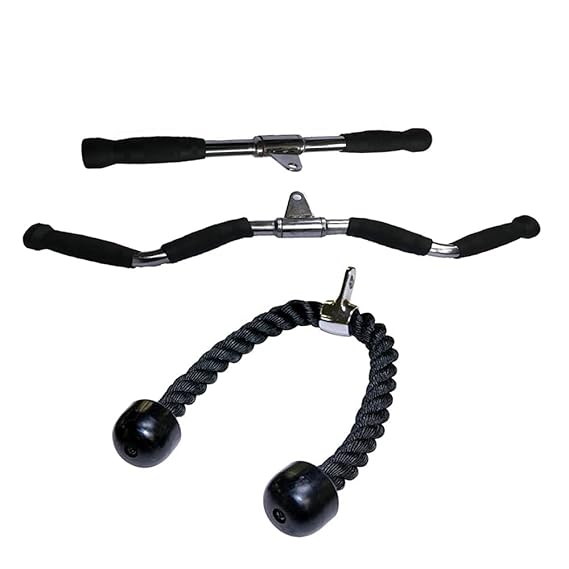 - High-polish chrome finish And Good Quality Steel. In Box : 1 Zig Zag Bar Handle, 1 Triceps straight Lat Bar,1 Triceps Rope Handle.
