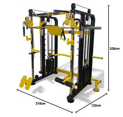 Built with heavy-duty steel framing, this machine integrates multiple workout stations that allow you to perform over 100+ exercises, covering every major muscle group. From cable crossovers and triceps pushdowns to squats, bench presses, and lat pulldowns, this machine redefines what total-body training looks like. The bright yellow and black industrial finish is not only visually stunning but also powder-coated for extra protection and durability.